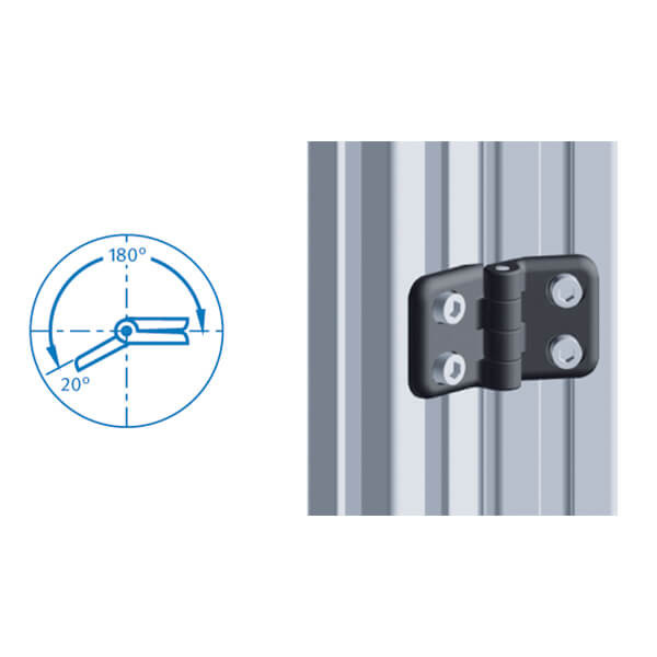 Bisagras para paneles y perfiles de aluminio. La fijación se realiza por laparte frontal mediante tornillos DIN 912 o ISO 7380 en M4.