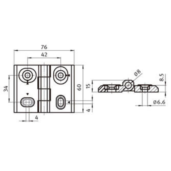 Bisagra fuerte para aplicaciones a izquierda y derecha. La fijación se realiza por la parte frontal mediante tornillos avellanados M6.
